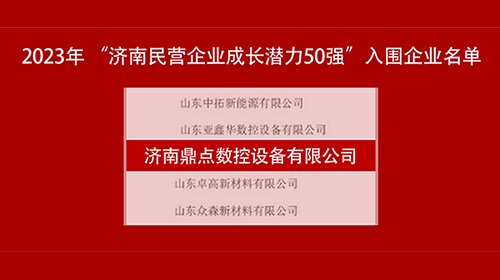 2023-09-23近日,濟南市民營經濟發展局發布“濟南民營企業成長潛力50強”名單。濟南鼎點數控設備有限公司(以下簡稱“鼎點激光”)憑借高速發展,創新潛能等方面的優異表現成功入圍“濟南民營企業成長潛力50強”榜單。