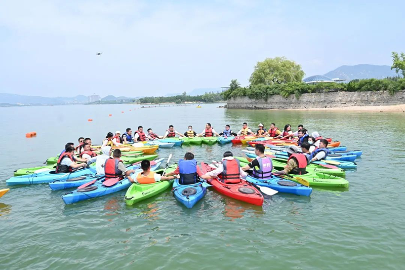 來到雪野湖的第一個游玩項目是“水上皮劃艇”,劃一艘小艇劈波斬浪,享受美麗的自然風光,大家都對于這個項目十分感興趣,興致勃勃地想要挑戰自己。很多同事都勇敢的突破自己, 體驗了一把“水上行走”,這種敢為人先,勇于突破的精神也正是鼎點企業一直秉持的信念。