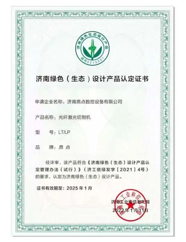 近日濟南市工業(yè)和信息化局文件公布了第二批濟南綠色(生態(tài))設計產品認定名單的通知鼎點激光(濟南鼎點數(shù)控設備有限公司)位列其中。